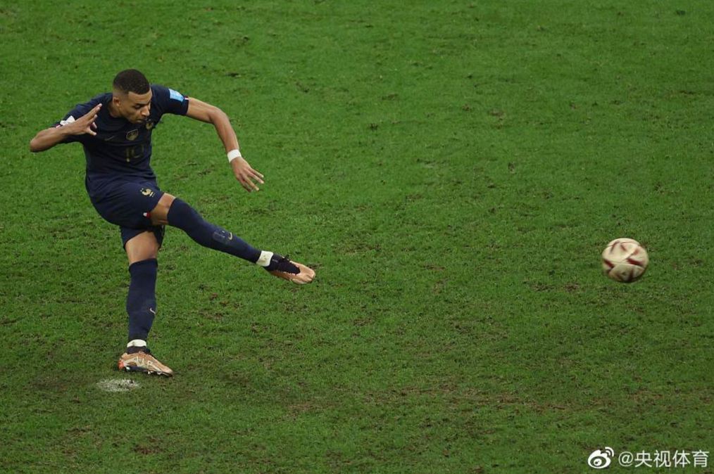 梅西補射破門(圖源央視體育)加時賽第117分鍾,姆巴佩主罰點球命中,上演帽子戲法!法國再次追平 ,3-3!姆巴佩打入本屆世界杯個人第8球。