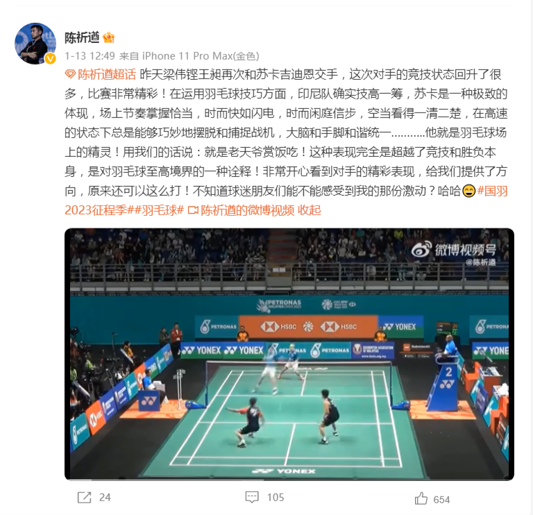 陳祈遒從裏約周期開始接任男雙組教練,2018年李俊慧/劉雨辰拿到世錦賽男雙冠軍,2019年國羽男雙稍有表現不佳 ,便有各路網友跑到陳指導的微博下開噴:為什麽不是你挑高我跳殺 ,就是我挑高你跳殺 ,能不能來點前半場連貫性訓練 ?