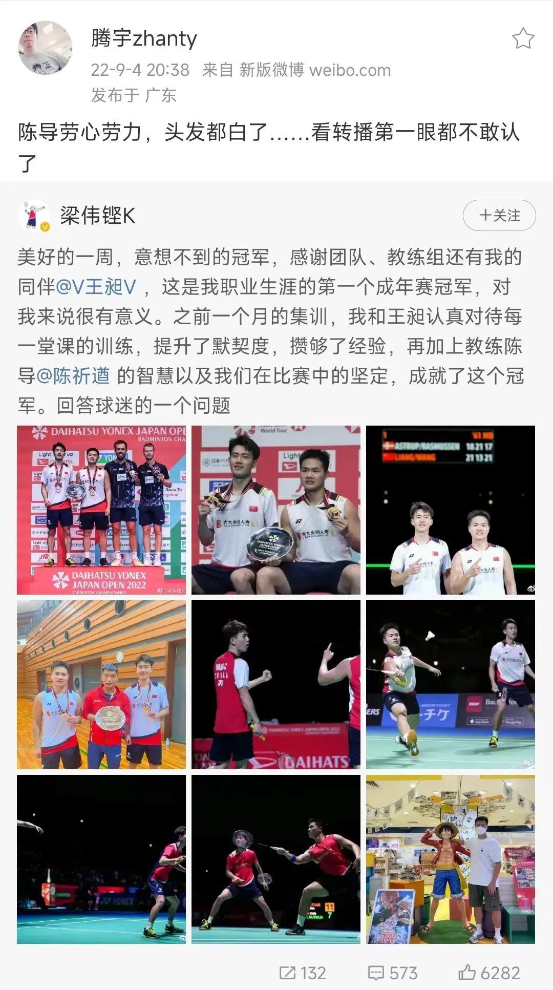 不久後,陳祈遒指導的教練生涯迎來了網絡小說裏才能出現的打臉爽文劇情 。9月初,Super750日本公開賽上 ,梁偉鏗/王昶拿到男雙冠軍 ,陳祈遒把與梁偉鏗王昶以及冠軍獎杯的合影 ,同當初在微博下麵罵他的言論截圖一一放出,並配文 :“所有的這些 ,都是我們前進的動力!”
