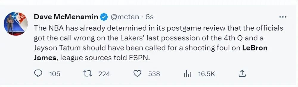 隨後ESPN記者戴夫-麥克梅納明也表示:聯盟已經告知ESPN ,在湖人V綠凱比賽第四節 ,裁判們的確漏吹了塔圖姆對詹姆斯的上籃犯規。