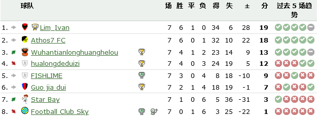 頂級聯賽第7輪全部結束後,瘋佬以3分優勢成功獲得半程冠軍,拜仁大佬 、7姐二隊皮皮以及金鱗大佬同積13分緊隨其後 。以下是本輪過後頂級聯賽的積分榜和下一輪對陣: