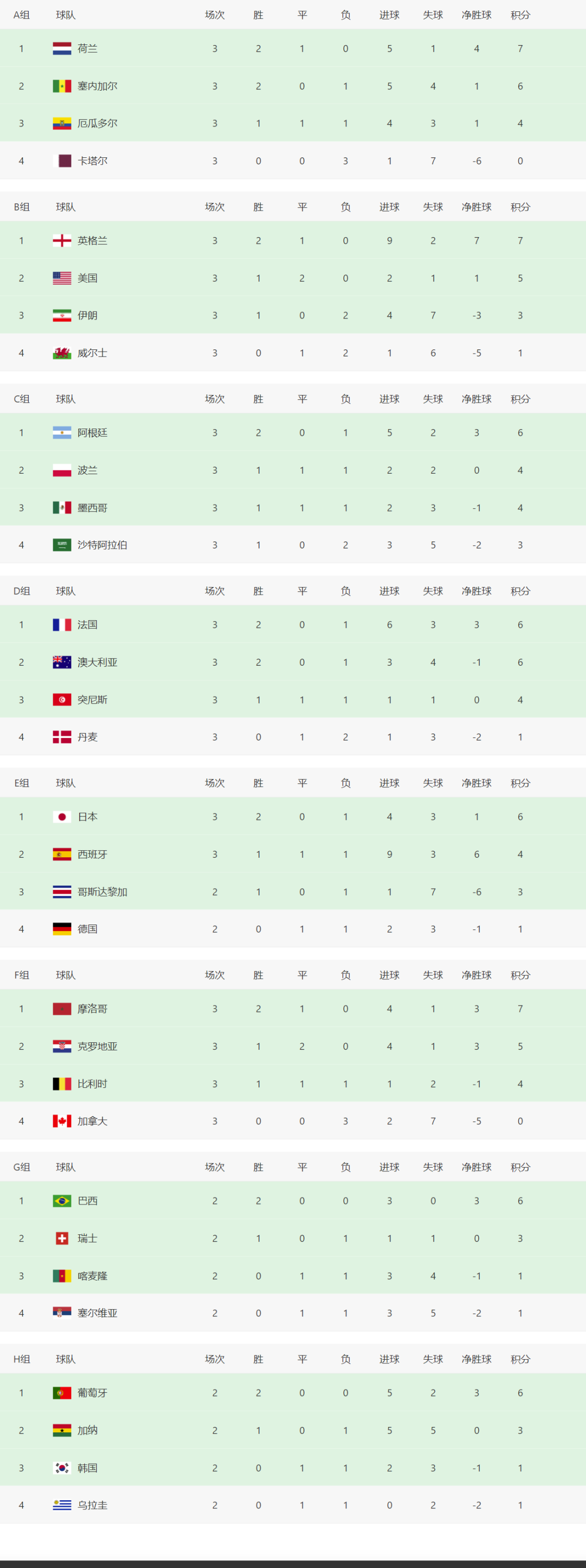 至此 ,本屆世界杯16強已敲定14支球隊 ,A組荷蘭和塞內加爾 ,B組英格蘭和美國,C組阿根廷和波蘭 ,D組法國和澳大利亞,E組日本和西班牙,F組摩洛哥和克羅地亞 。另外 ,還有2支球隊在第二輪提前晉級,分別是E組的巴西和F在的葡萄牙。
